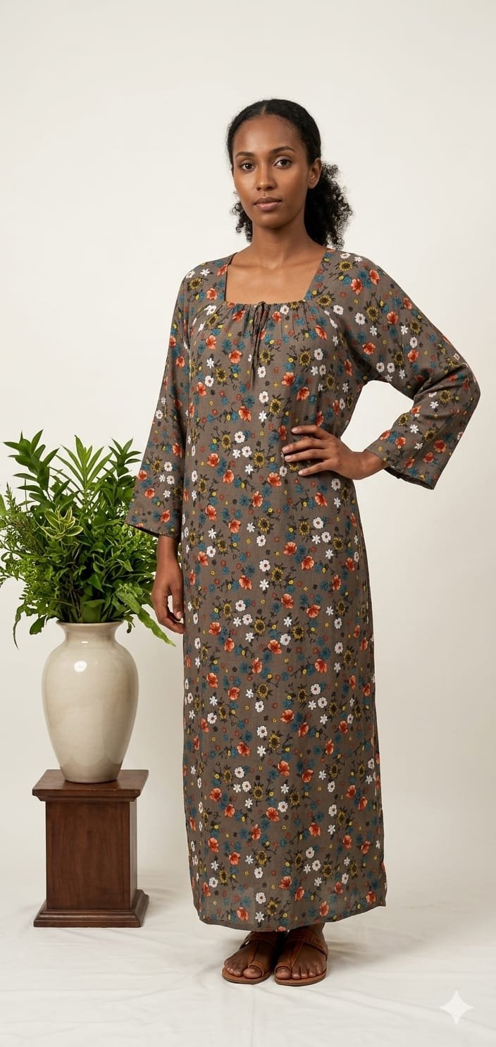 Jalabiya verte élégante à motifs floraux, au design fluide et confortable, parfaite pour un look quotidien chic et féminin.