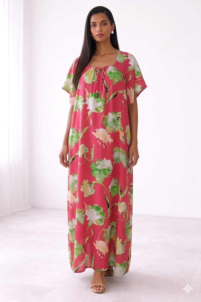 Jalabiya verte élégante à motifs floraux, au design fluide et confortable, parfaite pour un look quotidien chic et féminin.