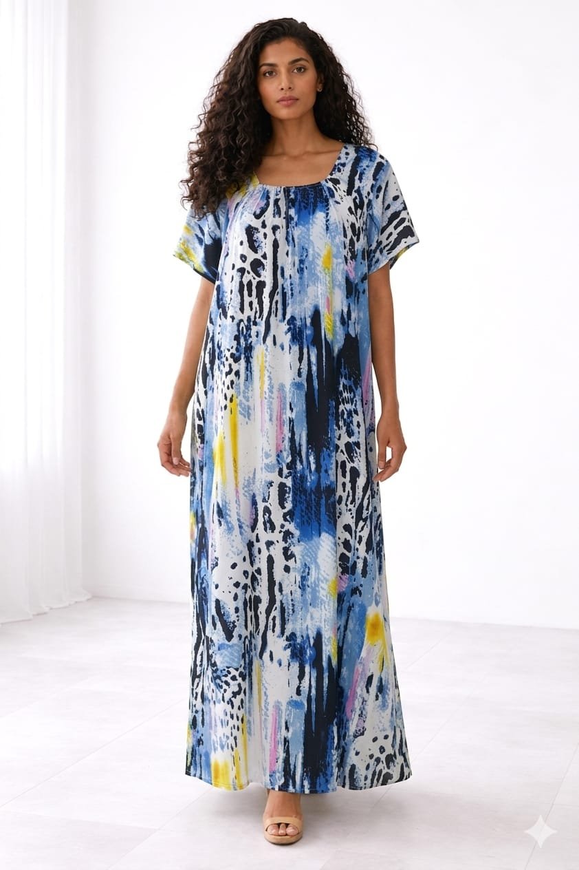 Jalabiya verte élégante à motifs floraux, au design fluide et confortable, parfaite pour un look quotidien chic et féminin.